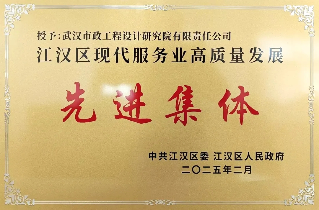 ? ? 近日,江漢區(qū)召開加快現(xiàn)代服務(wù)業(yè)高質(zhì)量發(fā)展大會,表彰轄區(qū)企業(yè)和企業(yè)家在推動江漢區(qū)高質(zhì)量發(fā)展中做出的突出貢獻(xiàn)。武漢市政院榮獲“現(xiàn)代服務(wù)業(yè)高質(zhì)量發(fā)展先進(jìn)集體”榮譽(yù)稱號,成為獲得此項(xiàng)殊榮的3家設(shè)計(jì)企業(yè)之一。