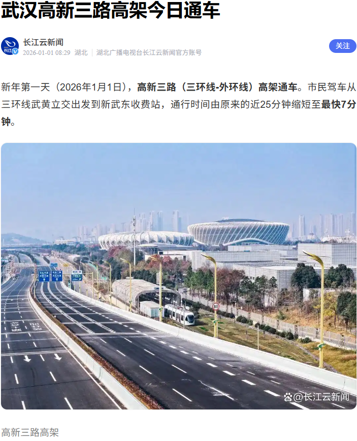 2026年1月1日,由武漢市政院參與設(shè)計(jì)的高新三路(三環(huán)線~外環(huán)線)改造提升工程主線高架通車!這條西起三環(huán)線武黃立交、東至新武東收費(fèi)站,總長10.7公里(其中主線高架8.23公里)的交通大動脈,以“主線高架+地面輔道”的立體格局,打通了光谷東向通行瓶頸,也承載著武漢市政院在綠色建造領(lǐng)域的技術(shù)突破,為武漢智慧交通建設(shè)樹立了新標(biāo)桿。