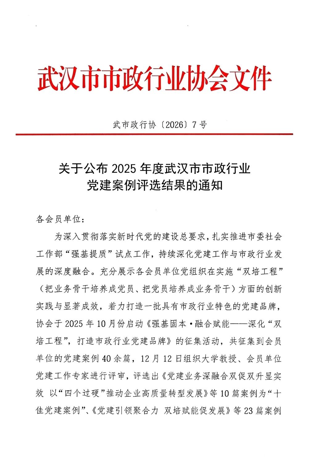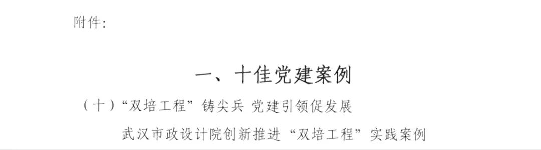 ? ? 近日,武漢市市政行業(yè)協(xié)會(huì)發(fā)布《2025年度武漢市市政行業(yè)黨建案例評選結(jié)果》,武漢市政院申報(bào)的創(chuàng)新實(shí)踐案例——《“雙培工程”鑄尖兵,黨建引領(lǐng)促發(fā)展》入選“十佳黨建案例”。