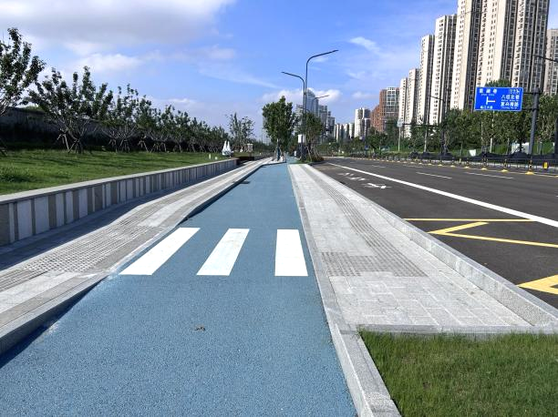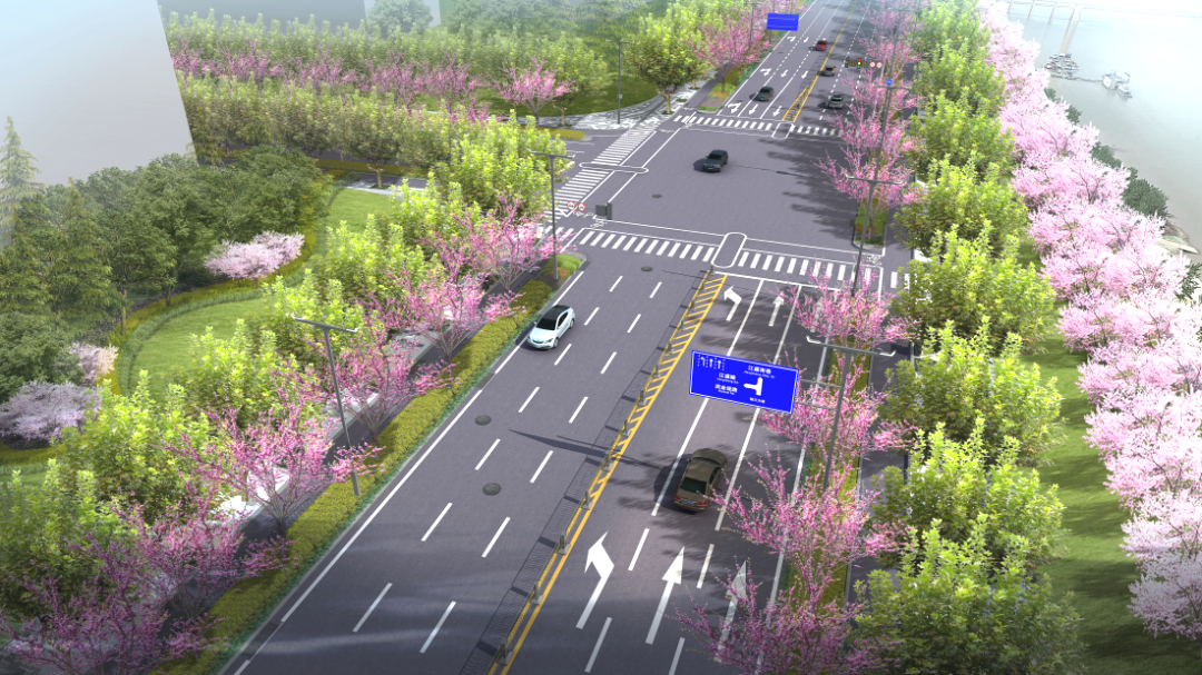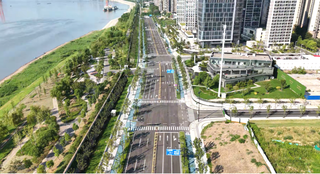 本項(xiàng)目北起江安路,南至八坦路,全長約2.58公里,規(guī)劃為城市主干路。道路紅線寬40米,采用雙向6車道設(shè)計(jì),并實(shí)現(xiàn)了人行道、非機(jī)動(dòng)車道與機(jī)動(dòng)車道的完全分離,充分保障了所有交通參與者的安全與路權(quán)。本次通車范圍江盛西路~八坦路段長約1.8公里,該段道路的通車,極大改善了周邊數(shù)萬居民的出行條件,有效緩解了區(qū)域交通壓力。尤為重要的是,本道路成功承擔(dān)起“縫合紐帶”的功能,將沿線城市地塊與長江江灘公園有機(jī)銜接,并與濱江綠化景觀帶相互融合,共同構(gòu)建出連續(xù)、舒適、優(yōu)美的綠道及景觀系統(tǒng),為廣大市民和游客提供了更優(yōu)質(zhì)的漫步、騎行與游覽體驗(yàn),切實(shí)提升了濱江區(qū)域的公共空間品質(zhì)。