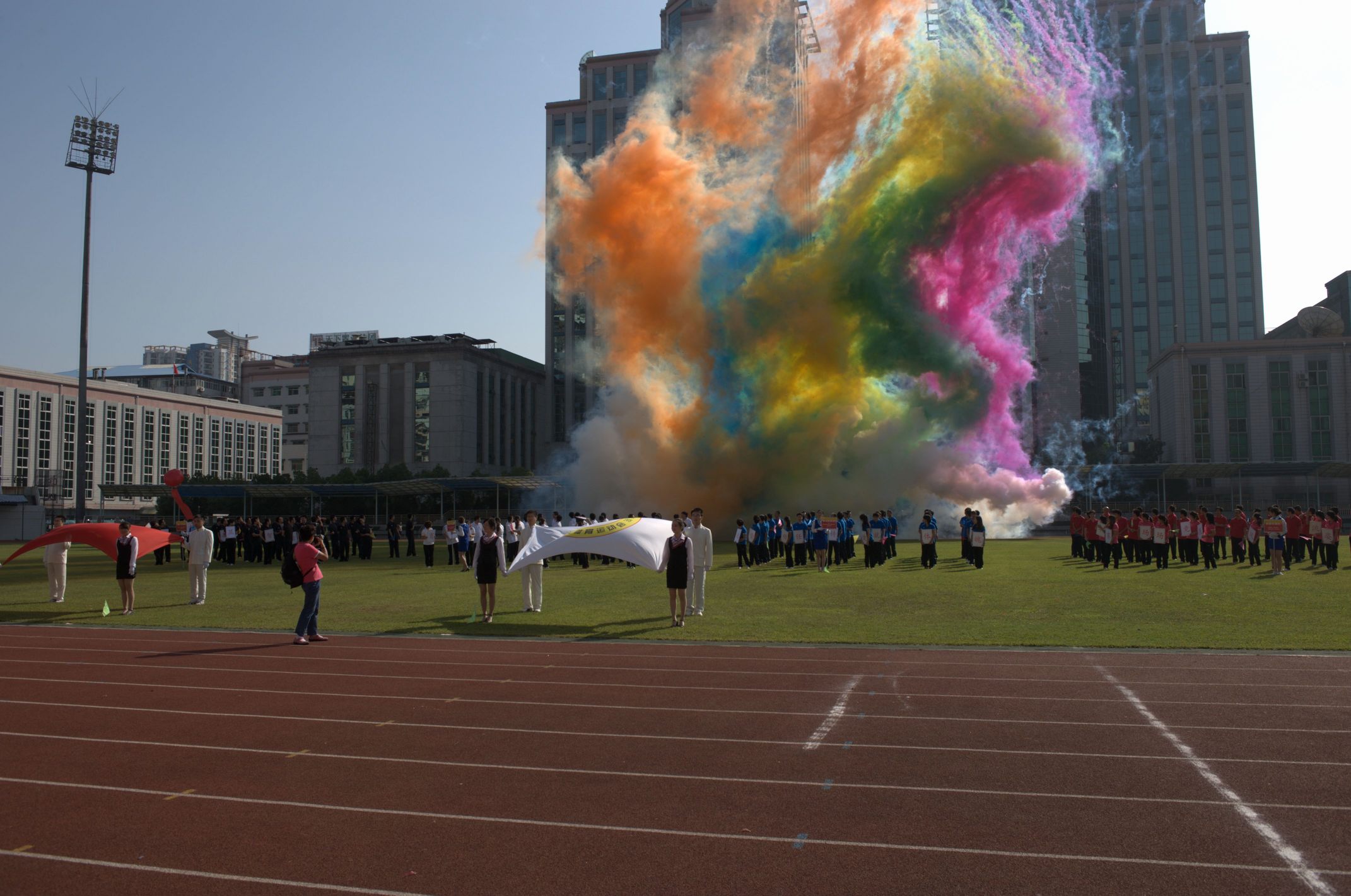??? 上午九點,開幕式正式開始。在激昂的運動員進行曲中,國旗方陣和會旗方陣先后從主席臺前經過,在他們的引導下,四支代表隊的運動員方陣依次入場,精神抖擻,步伐矯健,展示出了蓬勃向上的精神風貌。