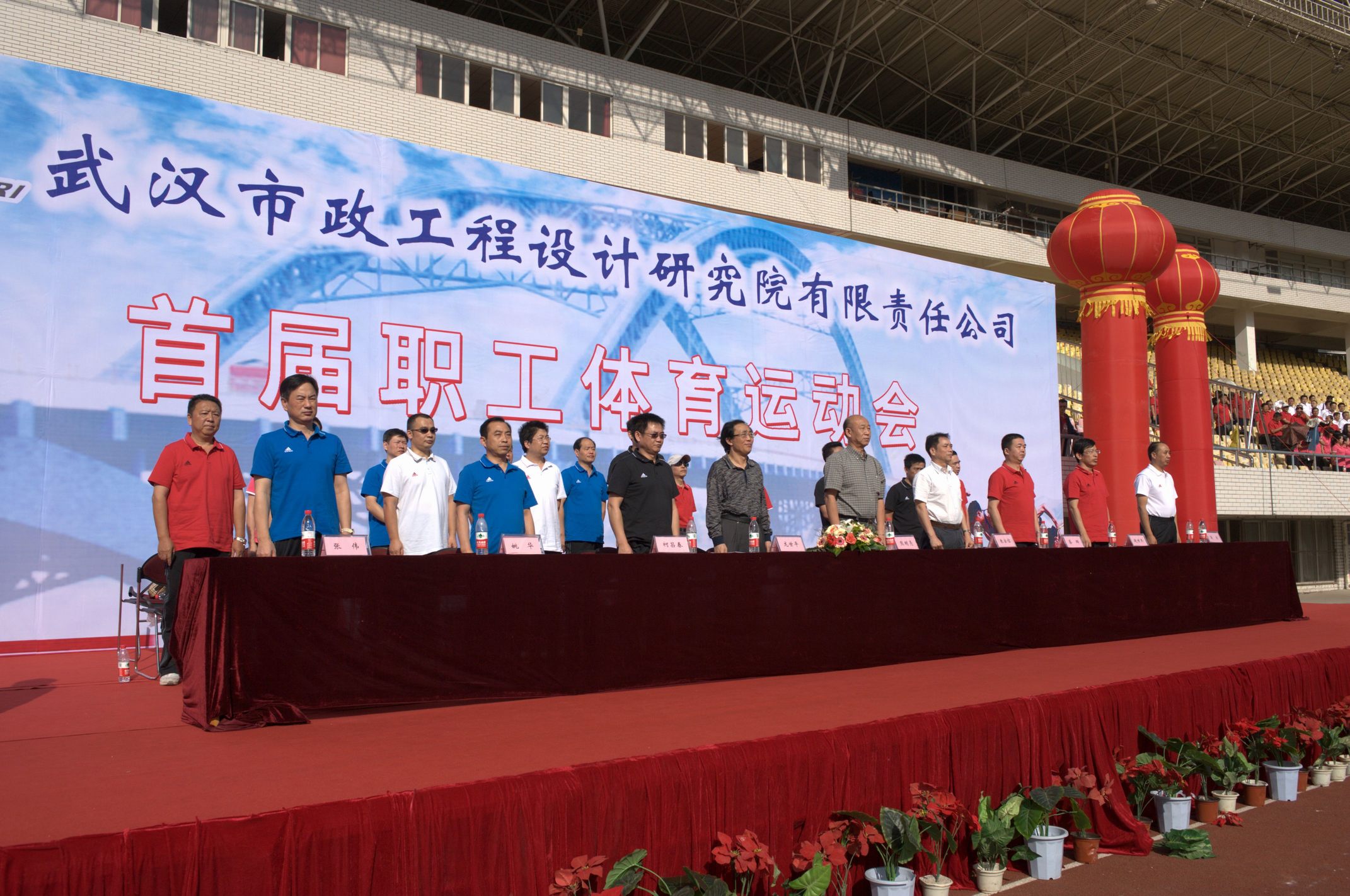 ??? 9月28日的漢口體育中心,彩旗飄揚,樂聲陣陣,在“我運動,我健康,我快樂”的巨幅背景前,紅色的主席臺被妝點得分外喜慶,十只巨大的彩色氣球懸掛著運動會的宣傳標語,烘托出熱烈的比賽氣氛。武漢市城建委黨組副書記、副主任熊明亮,武漢市城建委總工程師、首席市政工程專家龍世平,武漢市城建委工會主任朱宗信應邀出席了開幕式,公司領導和各部門負責人在主席臺就坐。