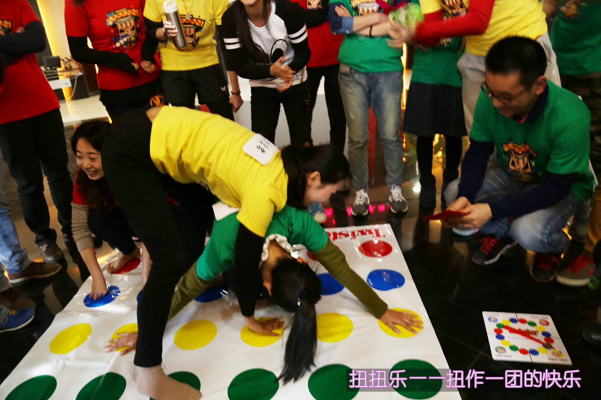??? 第四個環(huán)節(jié)是扭扭樂,每隊個派出一名隊員,根據(jù)主持人指針旋轉(zhuǎn)選定的顏色決定手腳需放置的位置,如站立不穩(wěn)或無色塊可放時即遭淘汰。最終,黃隊在這個考驗身體柔韌性和協(xié)調(diào)性的環(huán)節(jié)中勝出,同樣獲得了一個錦囊。
