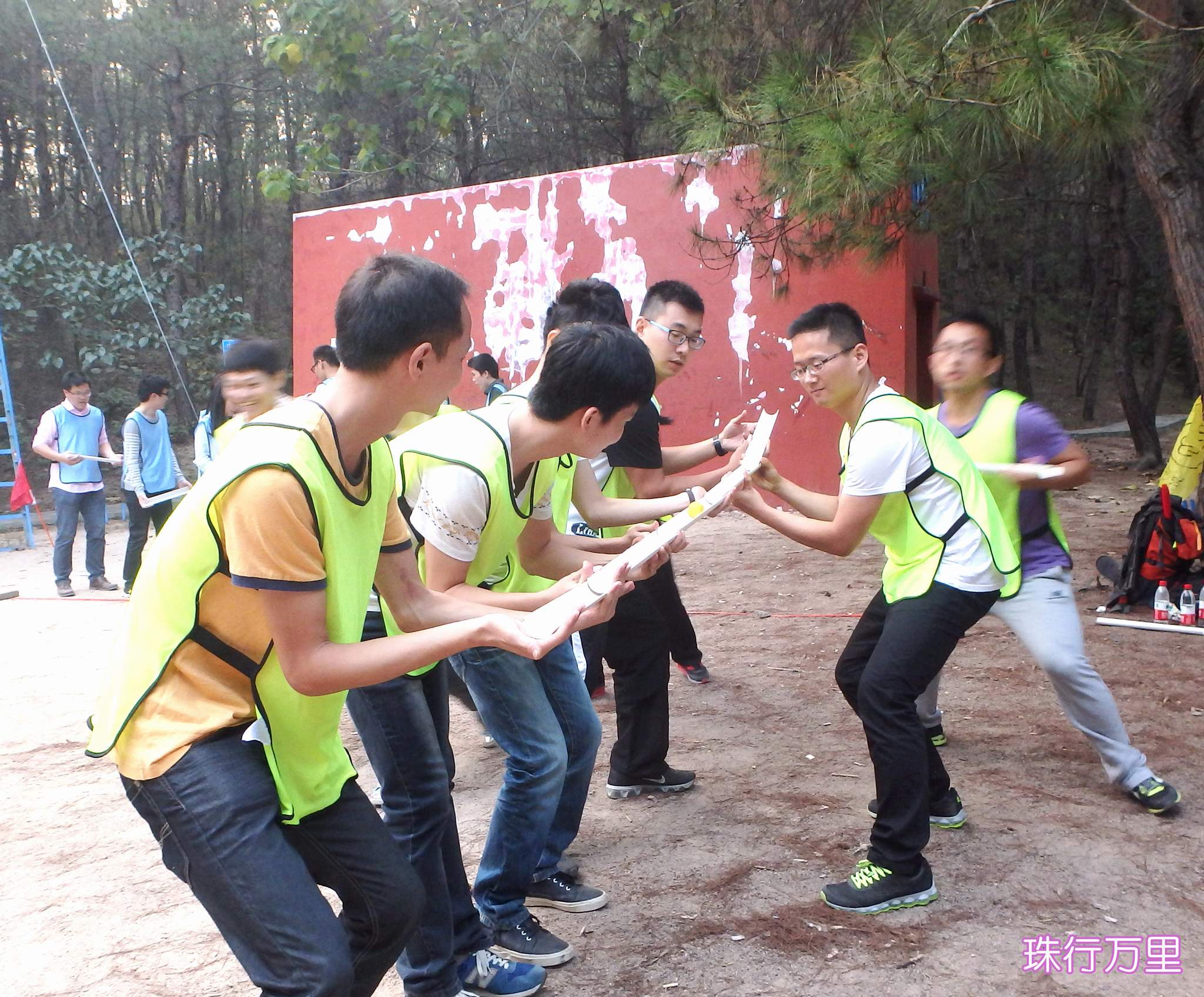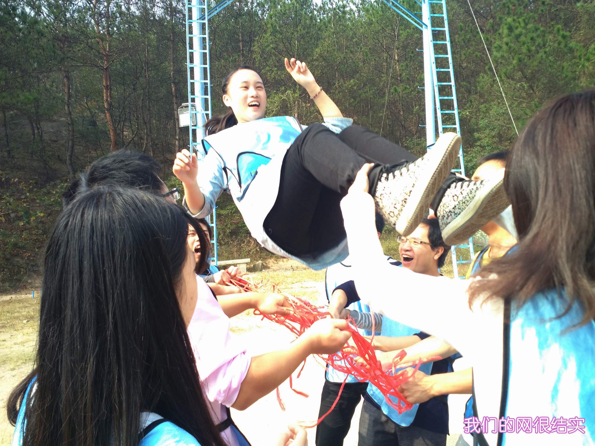 ??? 在抵達活動地點進行了簡單的破冰活動后,新員工們組成了兩支隊伍,并策劃了隊名、隊旗和口號。隨后,在教練員的帶領下,新員工們開始了一系列的拓展活動:“珠行萬里”,隊員們手持半圓形軌道接力將乒乓球運到終點,考驗的是團隊合作能力;“橫行天下”,多人多足的橫向移動,除了默契的團隊配合,也需要一定的技巧;“結繩織網(wǎng)”,細細的尼龍繩結成能承受一個人重量的網(wǎng),是對動手能力和創(chuàng)造能力的雙重考驗。